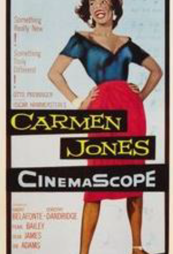 Laundry Room: Movie poster for Carmen Jones the tale of the cigarette-maker Carmen and the Spanish cavalry soldier Don Jose is translated into a modern-day story of a parachute factory worker and a stalwart GI named Joe who is about to go to flying school.