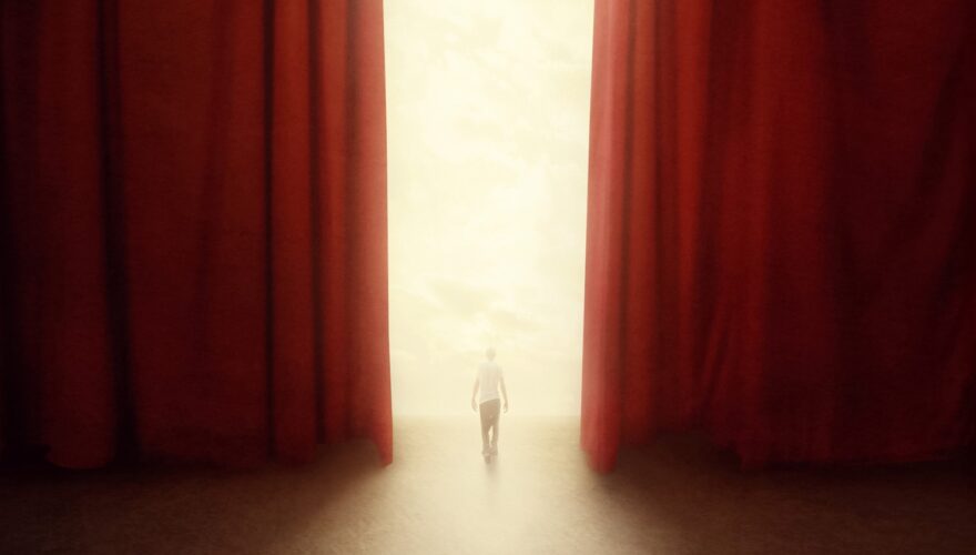 Front Desk Mural: I Will Rise II, by Michael Vincent Manalo, is a modern presentation of the dramatic red drapery that evokes the image of theatrical curtains from Midland's heyday in the 1920's while the contemporary figure makes the work feel of today.